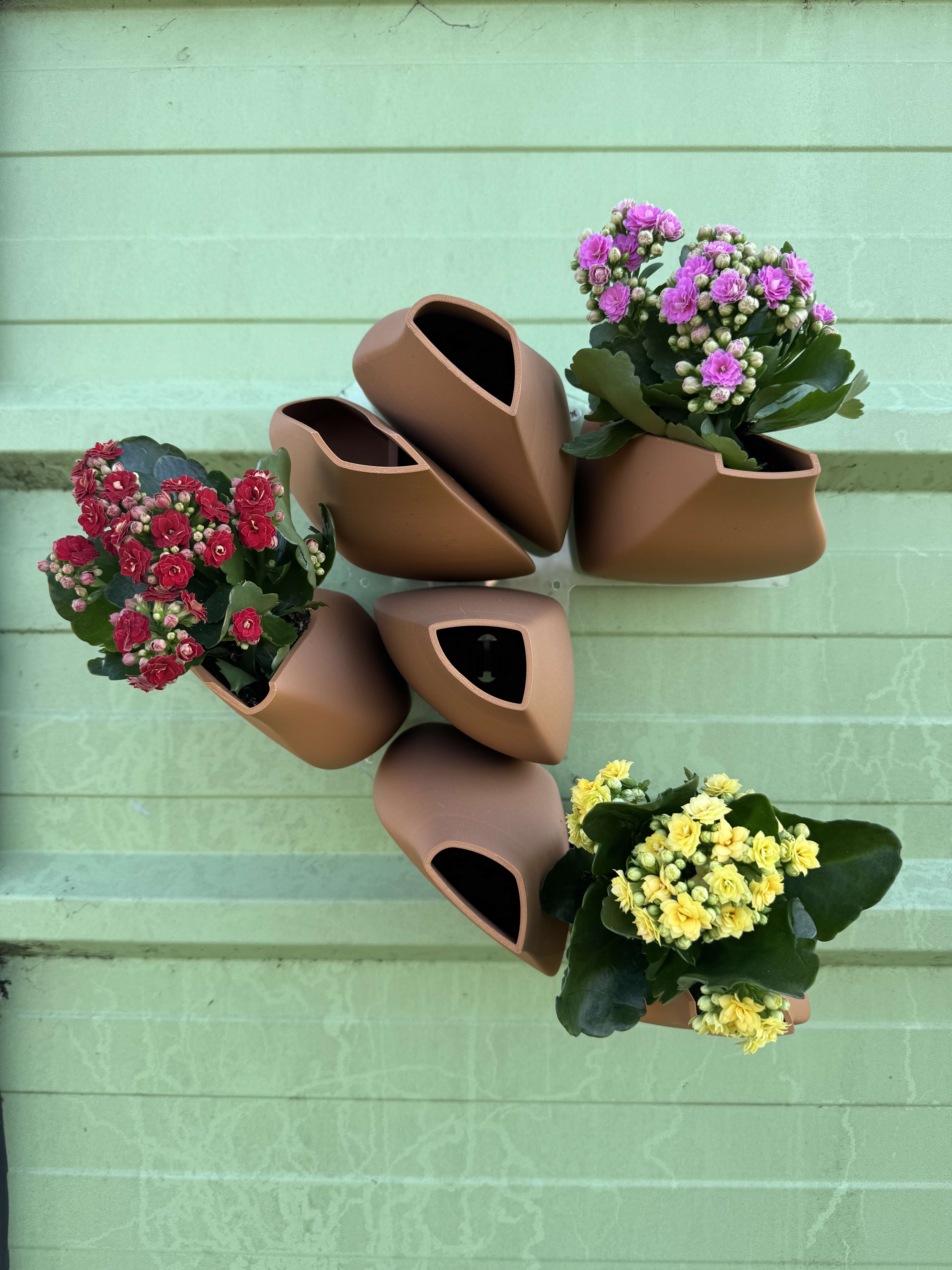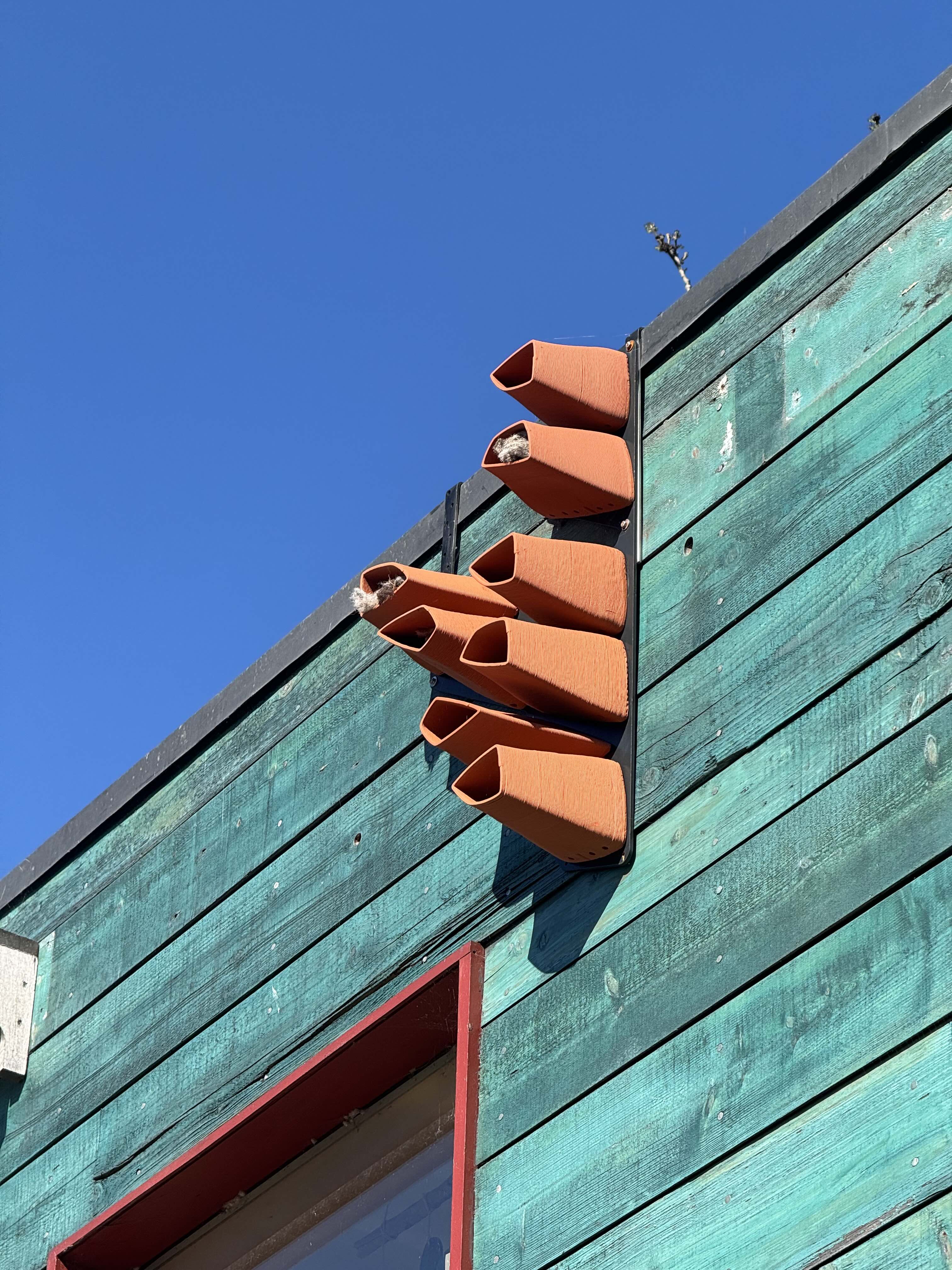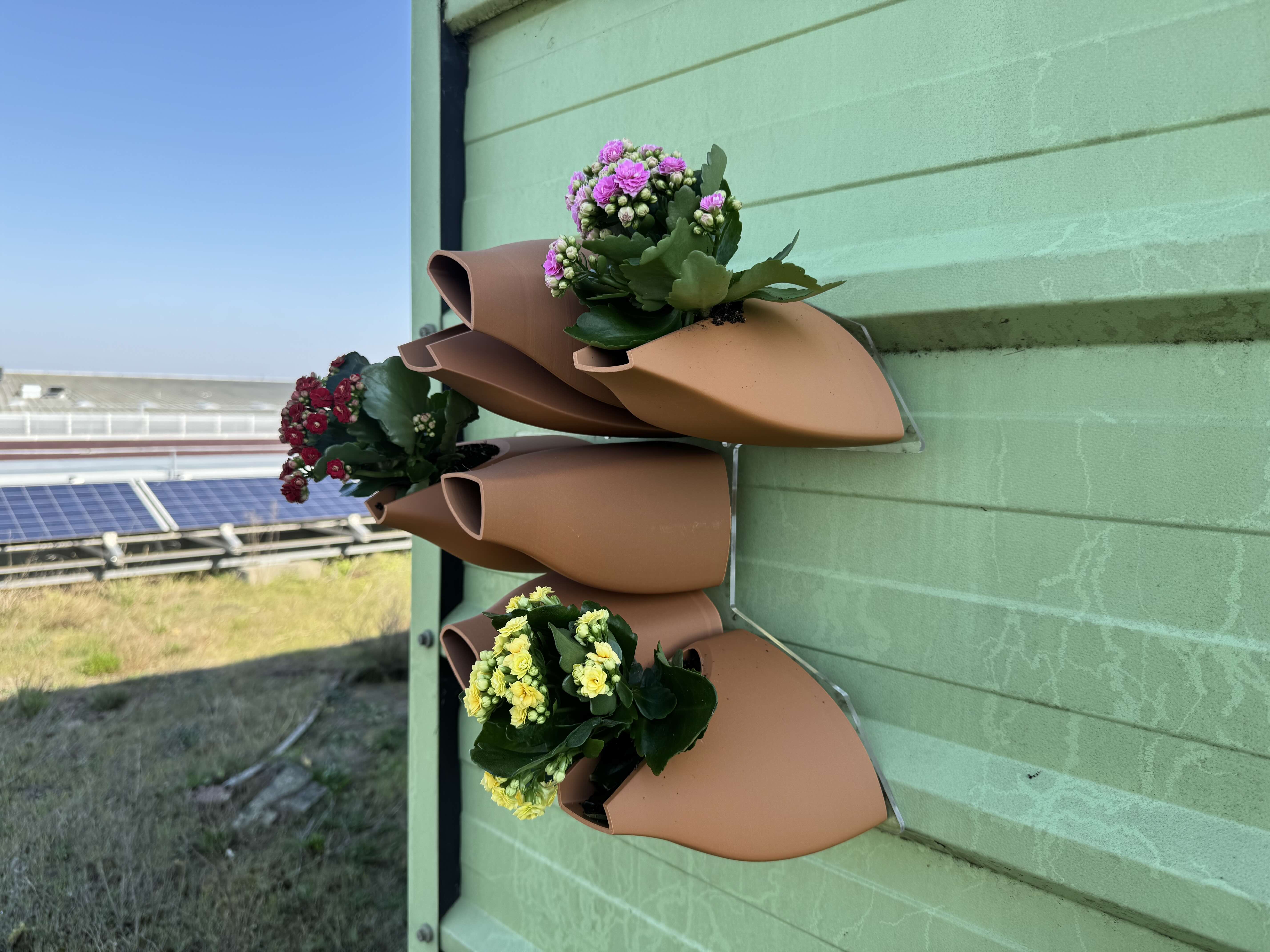 Installed pieces at site on the roof of Here East in Hackney Wick, London. Modules are printed from a composite material made of PLA and wood fibers. Using consumer-grade printers allows for quick and cheap iteration of the product. Lightweight and robust biomaterial improves ease of installation compared to ceramic and gives the system a lighter weight on building facades. It is crucial to reduce overall weight when installing the product across many square meters of facade surface.