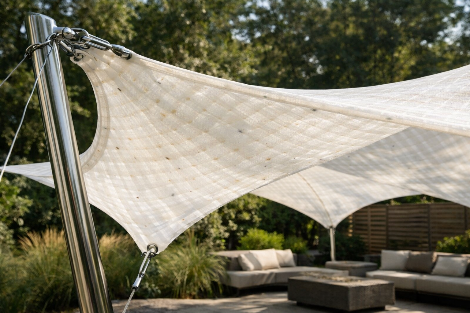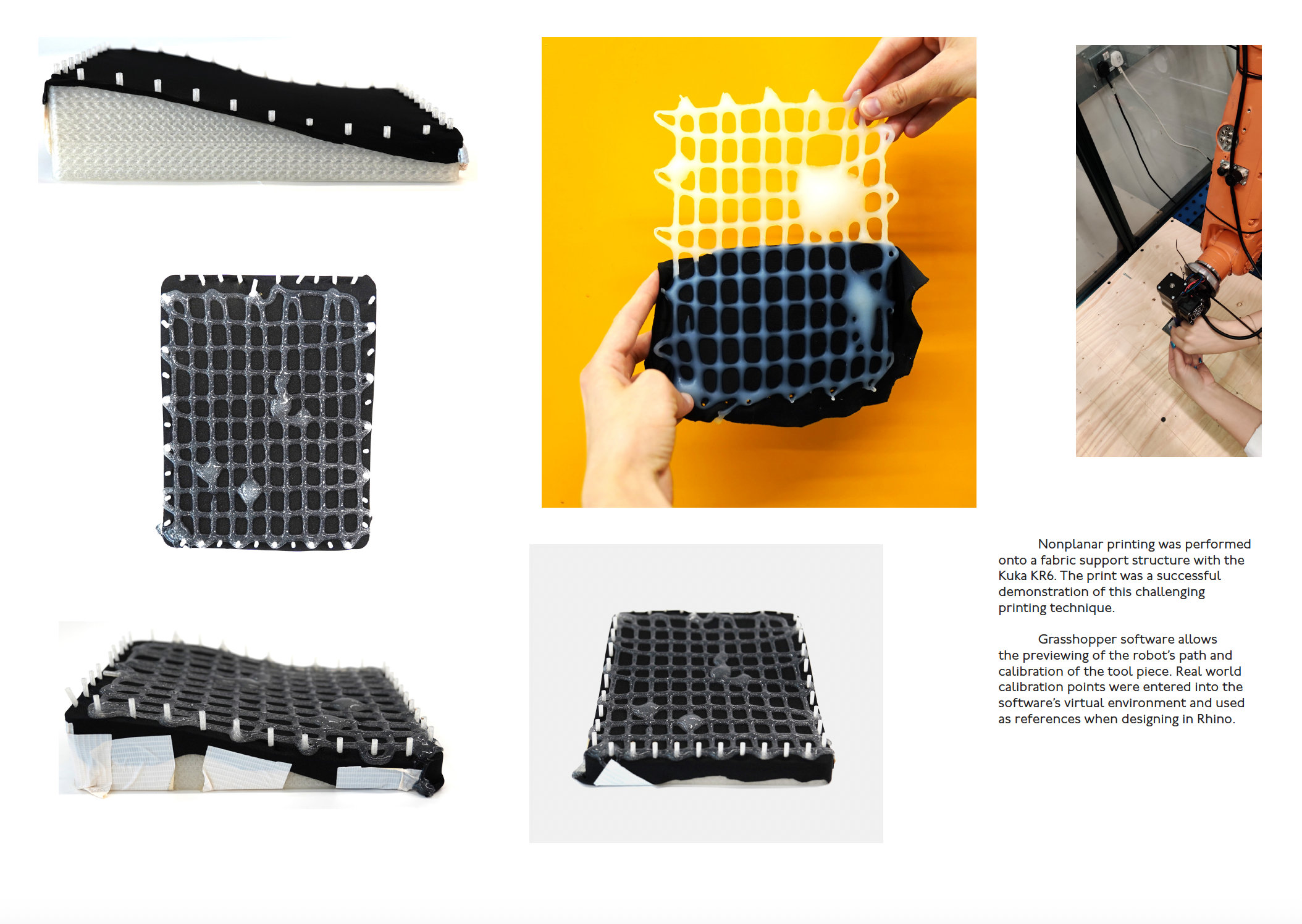 Building on the success of our initial test the design was pushed further. Non-planar prints were performed onto a flexible fabric support with a robotic arm. The supporting structure successfully held the extruded hydrogel and allowed us to demonstrate greater control over the form of the mesh. These studies unlock new possibilities to design large-scale canopy structures with living material.