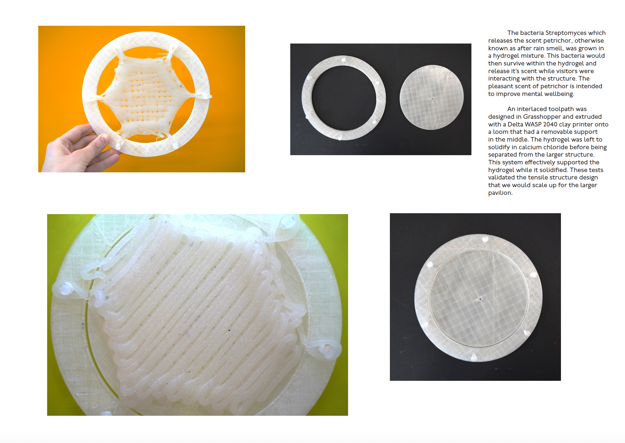 A hydrogel mixture with Streptomyces bacteria was extruded onto pegged supports. This hydrogel print is cross-linked with calcium chloride and solidifies into a flexible, silicon-like structure. Without support the material will shrink during cross-linking. Pegged supports were printed in order to keep the desired form, controling the shape of the final piece. This material design study shows an innovative method for designing a living fabric. After cross-linking the mesh is self-supporting and hosts the geosmin-producing bacteria. We were able to cultivate the bacteria within the mesh and successfully produced petrichor in a living canopy.
